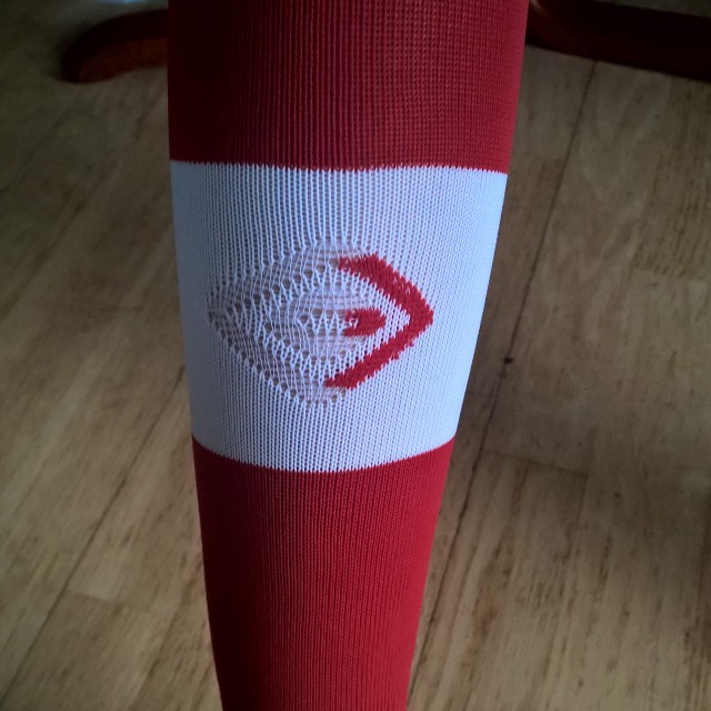 Stadium Sports Camp och spela fotboll en vecka. Han har packat idag och tog fram sina nya fotbollsstrumpor vi köpte i veckan. Han var inte helt nöjd med Umbro efter detta: