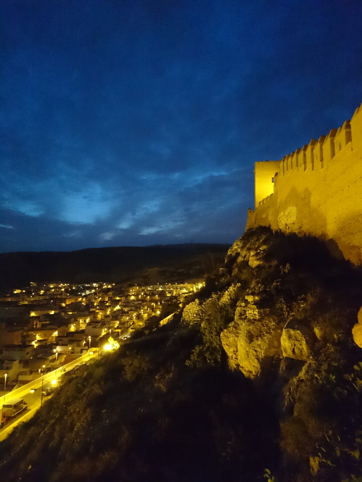 Slet av mig alla kläder, sjöblöt i svett av att gå 3 km hit. Blir spännande i morgon då. Lade mig på sängen och körde meditationsövning några minuter för att komma ner i varv. Sen gav jag mig ut på stan strax efter klockan 20. Köpte 2 yoghurt att ha till frukost och en avokado. Gick till det stora fortet Alcazaba som är skitgammalt. Började byggas när Almería blev en medina (stad) 955 och den byggdes det på 1012-1028. Det är en rest från den mooriska tiden. Efter det gick jag ner till havet i kolmörkret, hade tänkt doppa fötterna men såg verkligen inget.